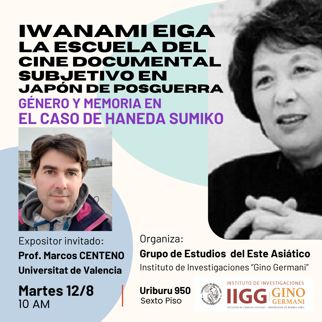 Desde el Grupo de Estudios del Este Asiático (GEEA) del @institutoginogermani invitamos a participar de esta sesión especial con el profesor Marcos Centeno, de la Universitat de València (España). En ocasión de su visita a la Argentina, tendremos la oportunidad de conocer mejor su trabajo en torno al cine documental japonés. En particular, nos hablará sobre la cineasta Sumiko Haneda.
