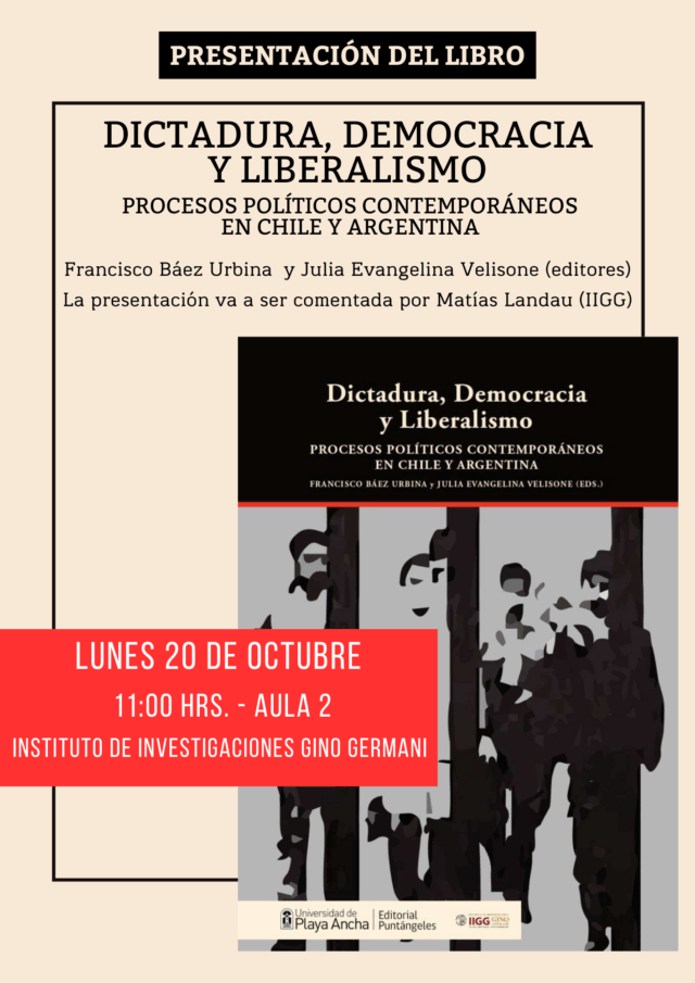 Presentación del libro «Dictadura, Democracia y Liberalismo» realizado entre la Universidad de Playa Ancha, Chile, y el Instituto de Investigaciones Gino Germani. La presentación será presencial y virtual a través del siguiente link