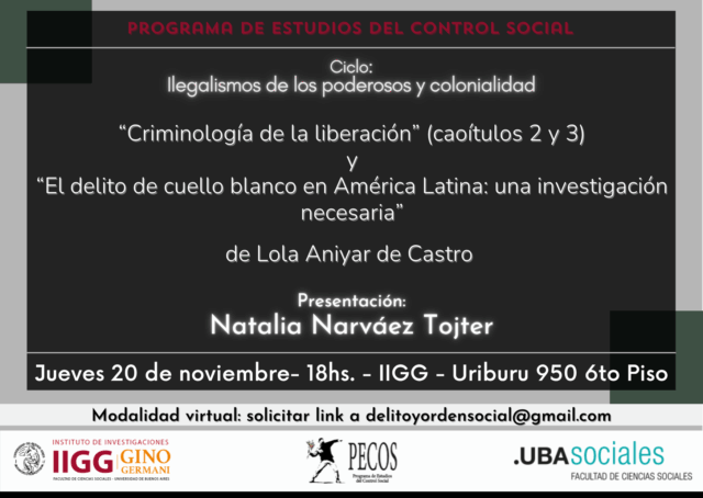 Encuentro del Programa de Estudios sobre el Control SocialJUE 20 NOV - 18 HS. | AULA 2 Aniyar de Castro, L. (1987). Criminología de la liberación. Maracaibo: Universidad del Zulia (selección) Aniyar de Castro, L. (1980). El delito de cuello blanco en América Latina: una investigación necesaria. ILANUD al día, 3(8), 79-81. Presentación: Natalia Narváez Tojter