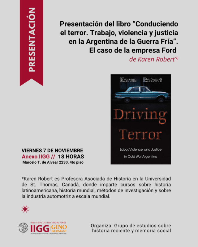 La investigadora canadiense Karen Robert* presentará su libro «Conduciendo el terror. Trabajo, violencia y justicia en la Argentina de la Guerra Fría». El caso de la empresa Ford.